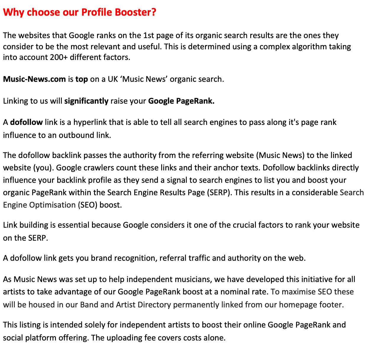 “Music News gave Scouting For Girls our first review and it was a good one! A well needed boost right at the start of our career."The Profile Booster is essentially a directory listing containing a short biography and all contact info.