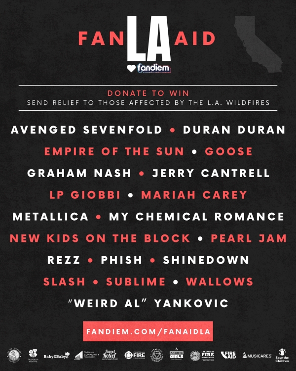 Participating artists in the FanAid LA initiative include Metallica, My Chemical Romance, Mariah Carey, Pearl Jam, Phish, Duran Duran, “Weird Al” Yankovic, Graham Nash, Slash, Goose, Sublime and Wallows, among many others. Each artist has generously contributed exclusive prizes, ranging from autographed items and one-of-a-kind memorabilia to VIP experiences, meet-and-greets, and all-expense-paid flyaways.