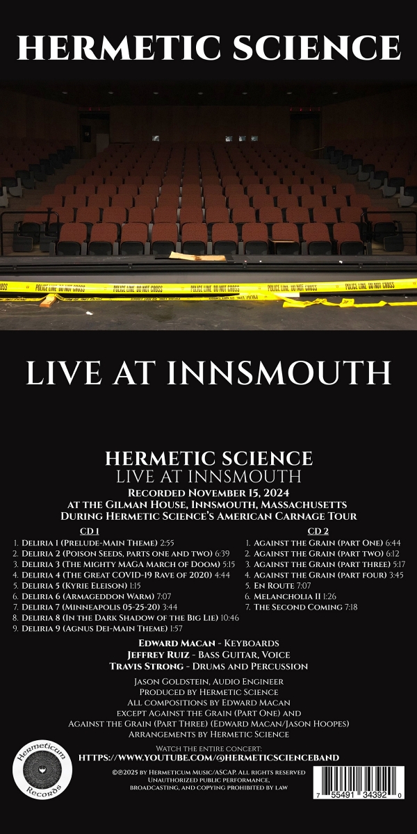Recorded at Innsmouth, Massachusetts' famed Gilman House on November 15, 2024, Live at Innsmouth captures Hermetic Science’s full 83-minute set, highlighted by a poweful rendition of the complete Deliria album, a radical reinterpretation of the classic Y2K suite "Against the Grain," and an incendiary closing performance of "The Second Coming." Not to be missed!