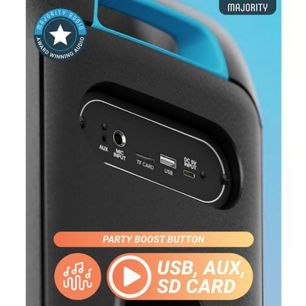 Connectivity and controls are kept simple and tactile. A neatly arrayed top panel houses playback, lighting, and pairing functions, while the rear I/O covers USB, SD card, AUX, and Type-C charging ports. Build quality feels reassuringly solid, with Majority’s usual attention to durability.