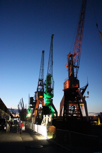 After a pleasant 15 minute boat-ride to the floating dock we were soon surrounded by huge uplit cranes and enticing BBQ stalls and bars. The voice of three time Grammy Award winning Dee Dee Bridgewater floated from the main stage as she chatted away to her audience as if at a tea party. Word was she was still in the Reeperbahn at 4am that morning, no mean feat at the age of 65.